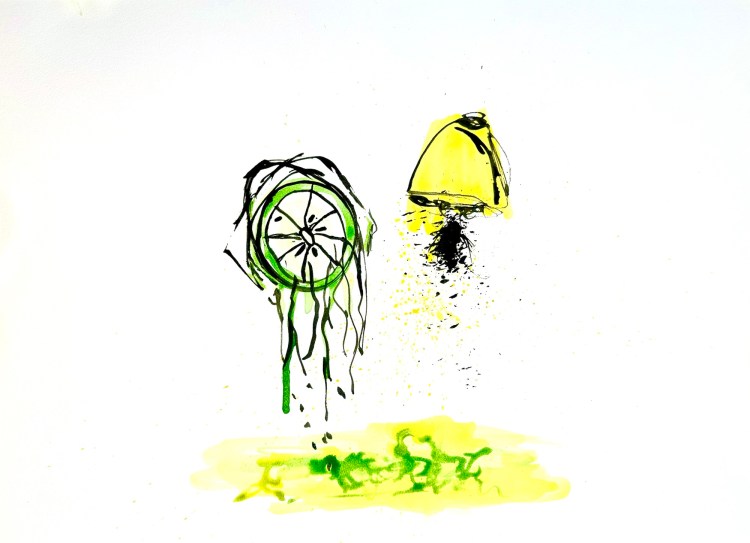 Lime and Lemon Juice. 2024. India ink and acrylic on watercolor paper.