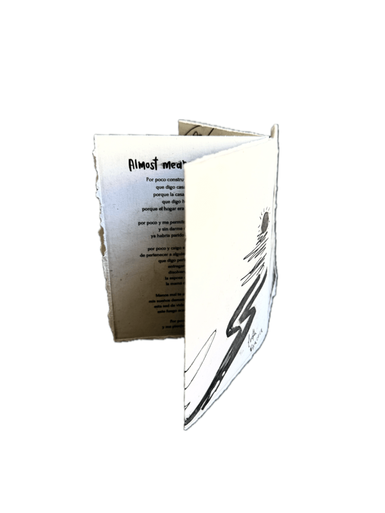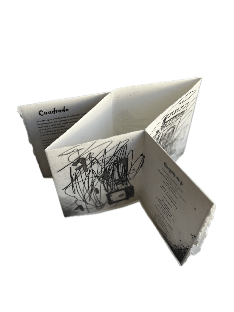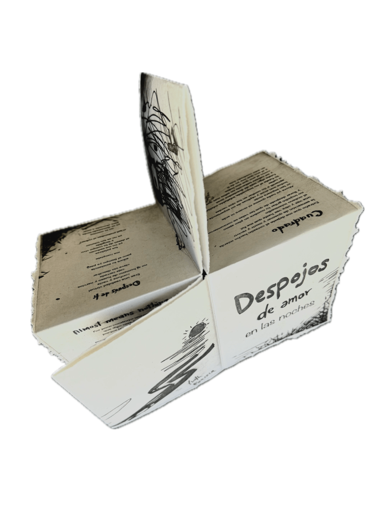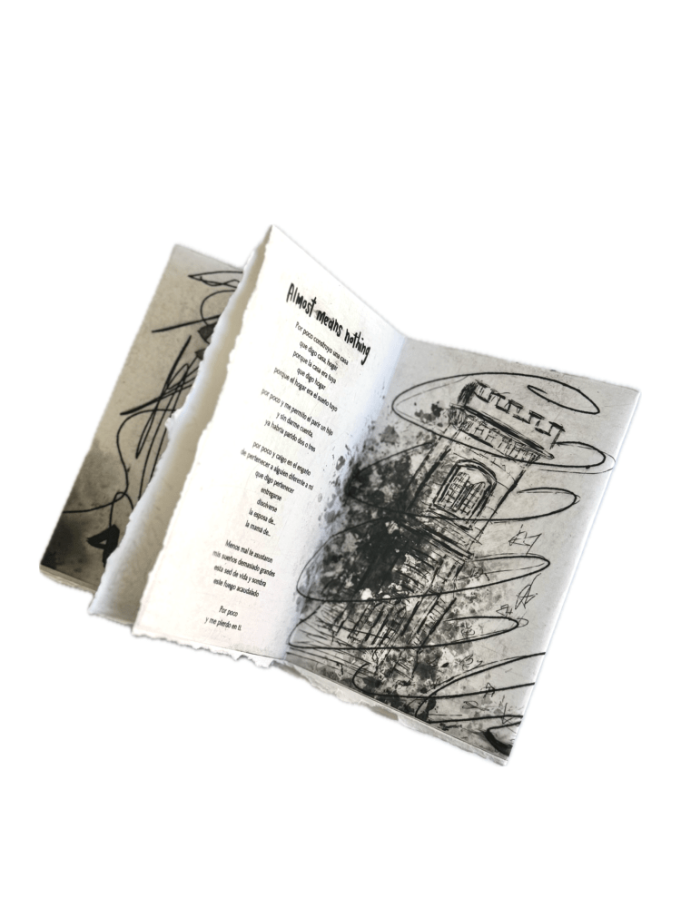 Three poems about heartbreak form the central axis of this artist’s book, accompanied by original illustrations created specifically for this medium. The unfinished, the poorly made, the usually discarded, are transformed into active material that supports the visual and poetic discourse. Error becomes form, and intimate pain becomes testimony. This work proposes an affective archaeology: graphic and verbal remnants of a love that dissolves, like a house split in two. There is no technical perfection—only emotional persistence. Each copy is an archive of the attempt: to love, to create.